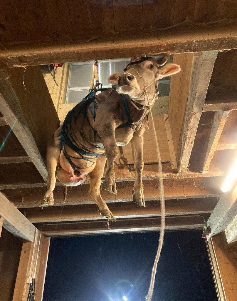 Kuh Bonita konnte nach dem Abkalben aufgrund von Milchfieber nicht mehr aufstehen. Da neben regelmässiger Kontrolle des Allgemeinzustandes, Blutkontrolle und entsprechenden Infusionen die richtige Lagerung sehr wichtig ist, wurde Bonita kurzerhand mit dem Kran auf den Heuboden gebracht. Da wurde sie weich gebettet und regelmässig gewendet, um die Muskulatur aufgrund des hohen Körpergewichtes zu entlasten.